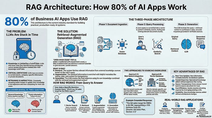 With over 80% of business AI applications using RAG, understanding this pattern is essential for anyone building with generative AI.
